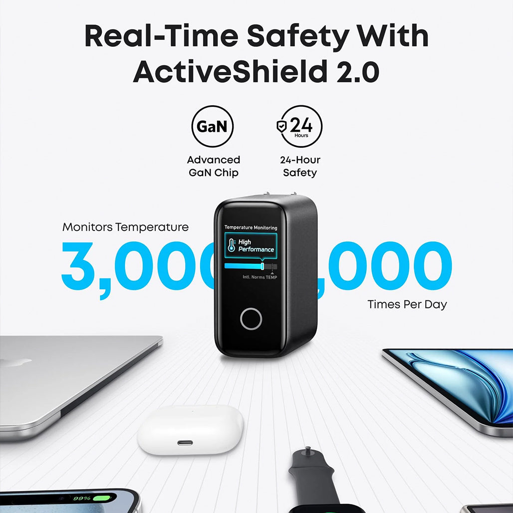 With dual high-speed USB-C ports that each deliver up to 140W, plus additional multi-device support, you can keep up to four gadgets powered at once. The integrated ActiveShield™ 2.0 safety system monitors temperature over 3 million times per day, while the smart HD display provides real-time charging details at a glance.