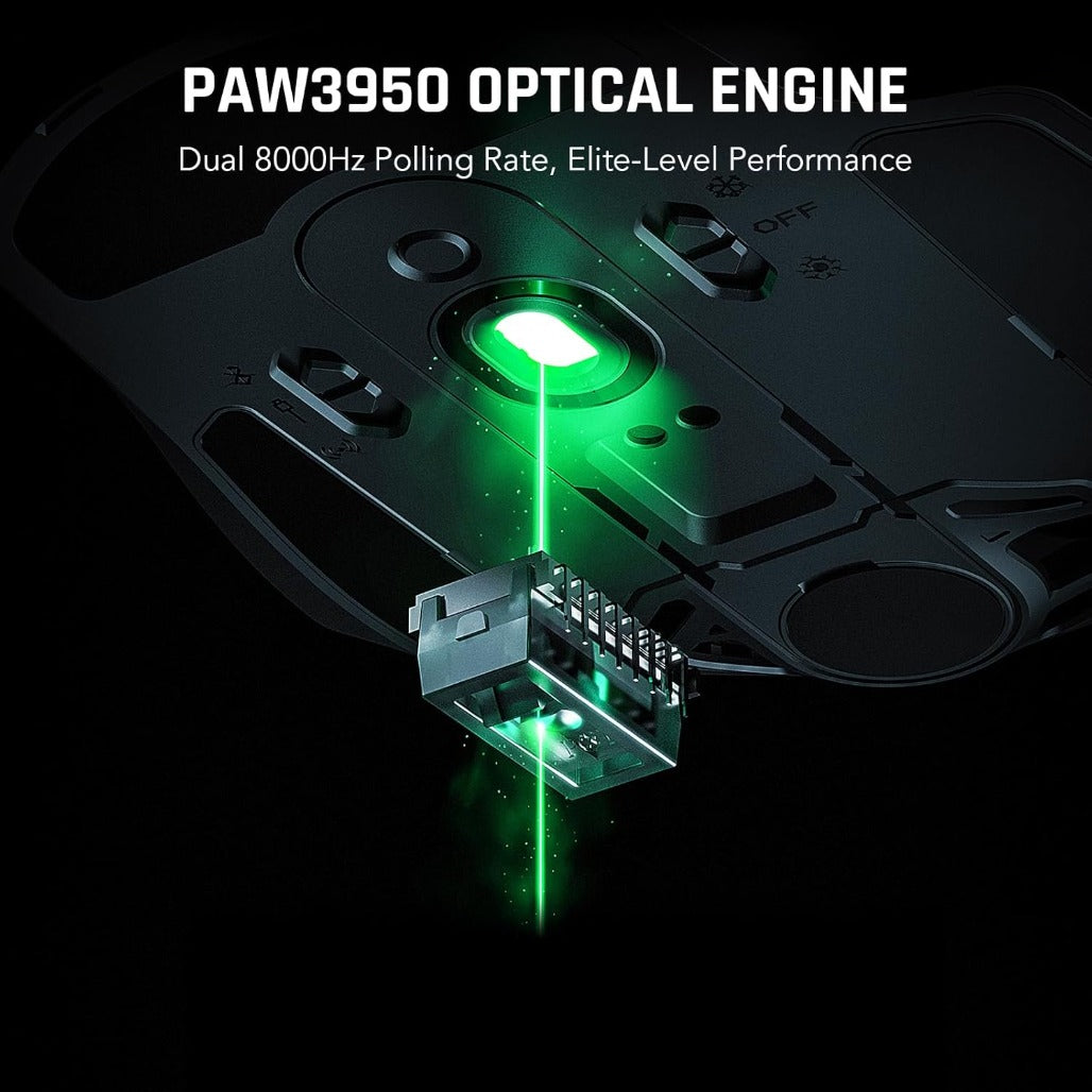 Precision meets power with the flagship PAW3950 optical sensor delivering up to 30,000 DPI, plus customizable presets and software-based fine-tuning for perfect control in FPS and esports titles. Enjoy a true dual 8KHz polling rate (0.125ms latency) in both wired and wireless modes, so every movement and click registers instantly. A RGB charging dock adds a premium look while delivering up to 100 hours of battery life for marathon sessions. Everything you need is included: the mouse, charging dock, 2.4G receiver, 1.5m braided USB-C cable, and user manual.