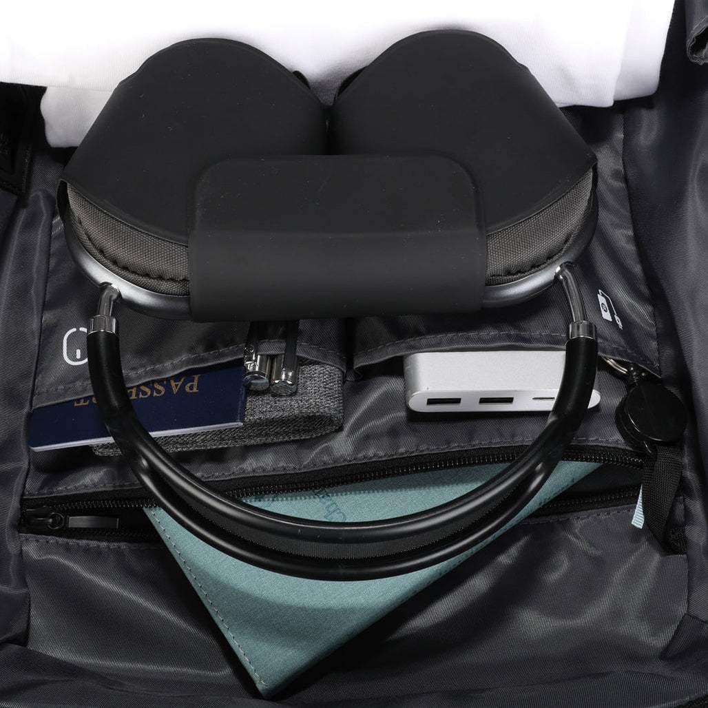 A rear luggage strap securely attaches the backpack to your suitcase handle, making it the ideal carry-on bag for flights and train travel.