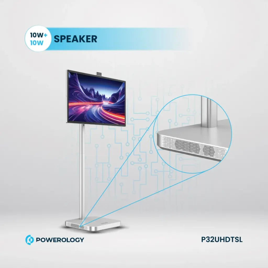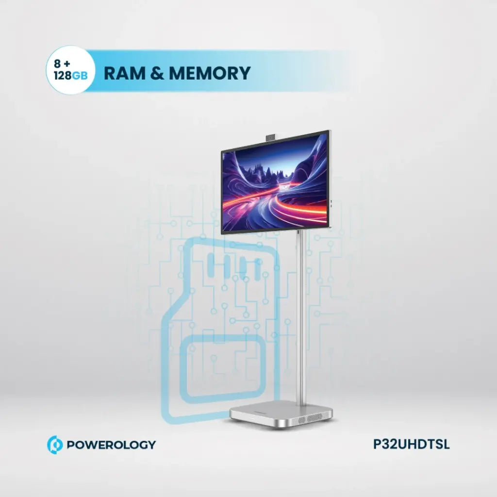 The Powerology 32” Android UHD Tablet with Stand is a premium all-in-one device designed for entertainment, productivity, and video conferencing. Featuring a 31.5-inch 4K UHD display (3840 × 2560), it delivers ultra-clear visuals for streaming, meetings, and multitasking. Powered by Android 13, 8GB RAM, and 128GB storage, it ensures smooth performance with ample space for apps, files, and media.