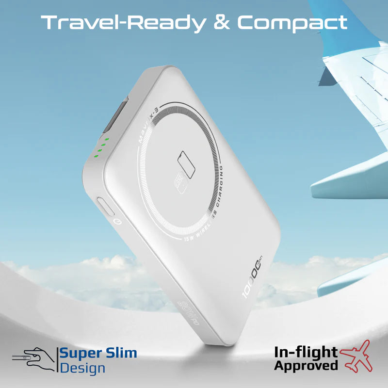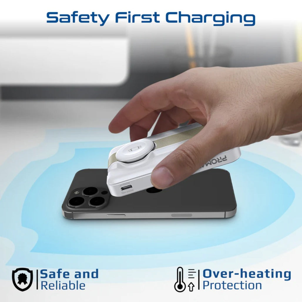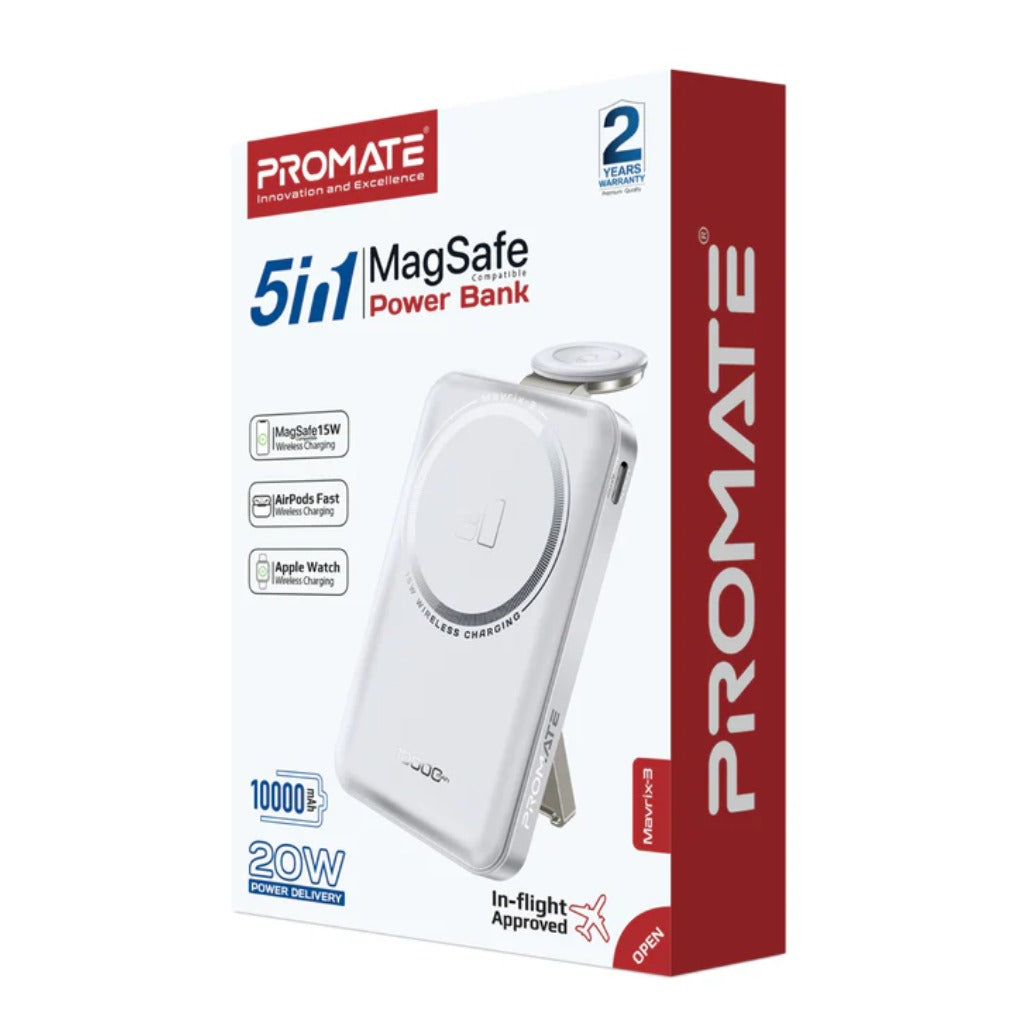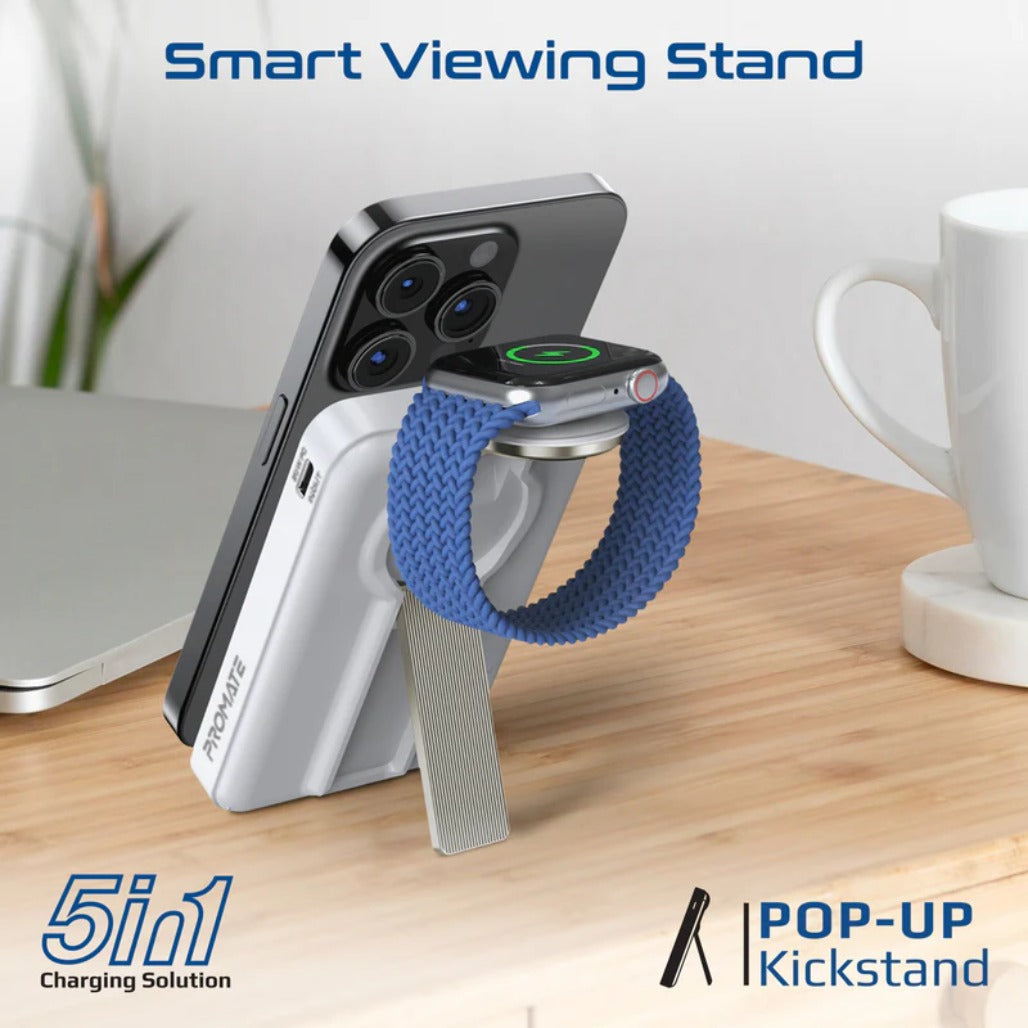 Promate Mavrix-3 Ultra-Compact 3-in-1 MagSafe-compatible wireless charging power bank blends power and portability for your on‑the‑go lifestyle. Inside a slim, lightweight frame sits a 10000mAh Li-Polymer battery, delivering reliable charge when you’re away from a wall outlet. It offers seamless 15W wireless charging for iPhone and Apple Watch and a 20W USB-C Power Delivery port for fast wired charging. Strong N52 magnets ensure secure MagSafe alignment, while a foldable zinc-alloy kickstand doubles as a mini dock for hands-free viewing. With advanced safety features like overcharging protection, overheating prevention, and Foreign Object Detection, you can charge confidently wherever you roam.