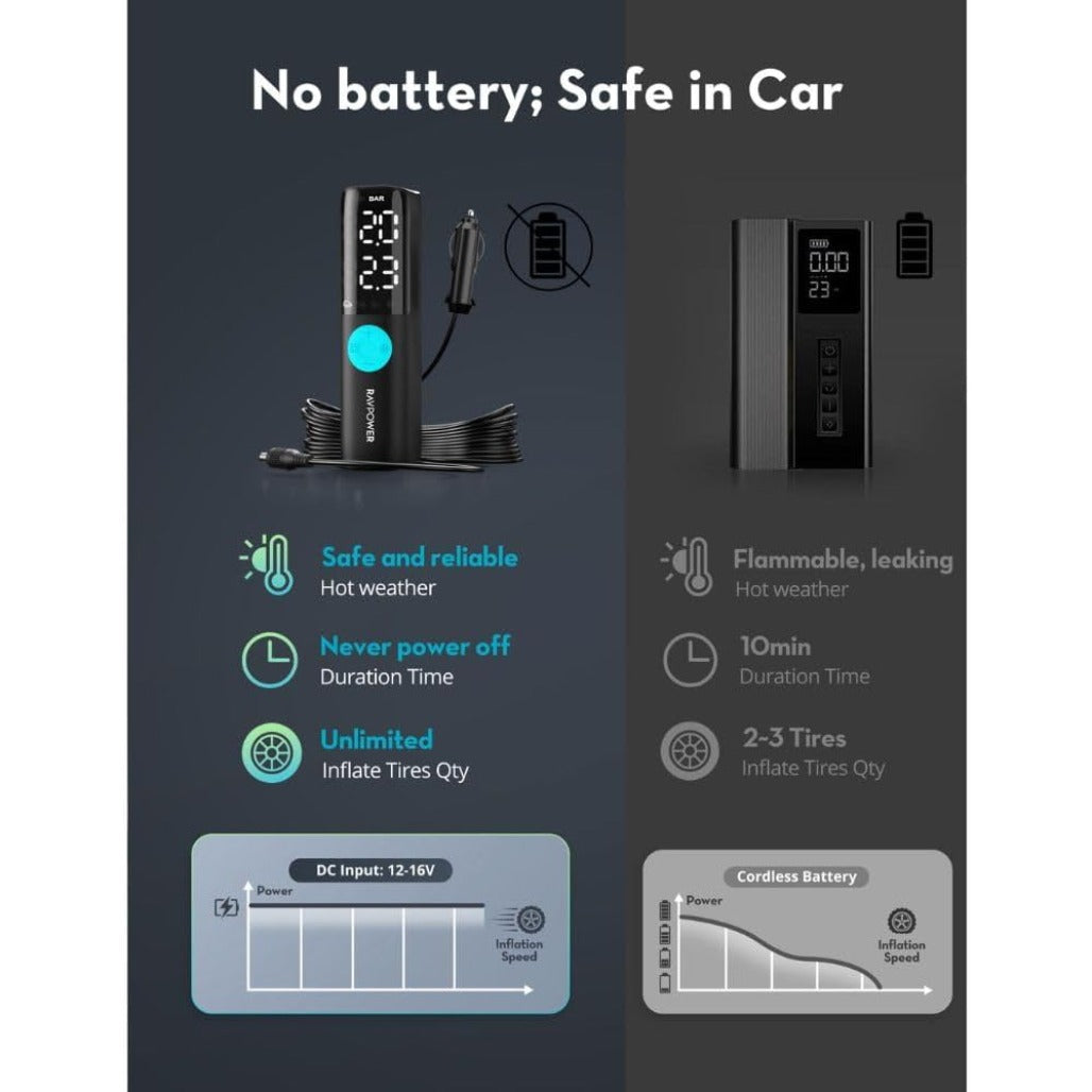 RAVPower Basic 60W Battery Free Air Pump 12-16V Output 25L/Min with Digital LED Display