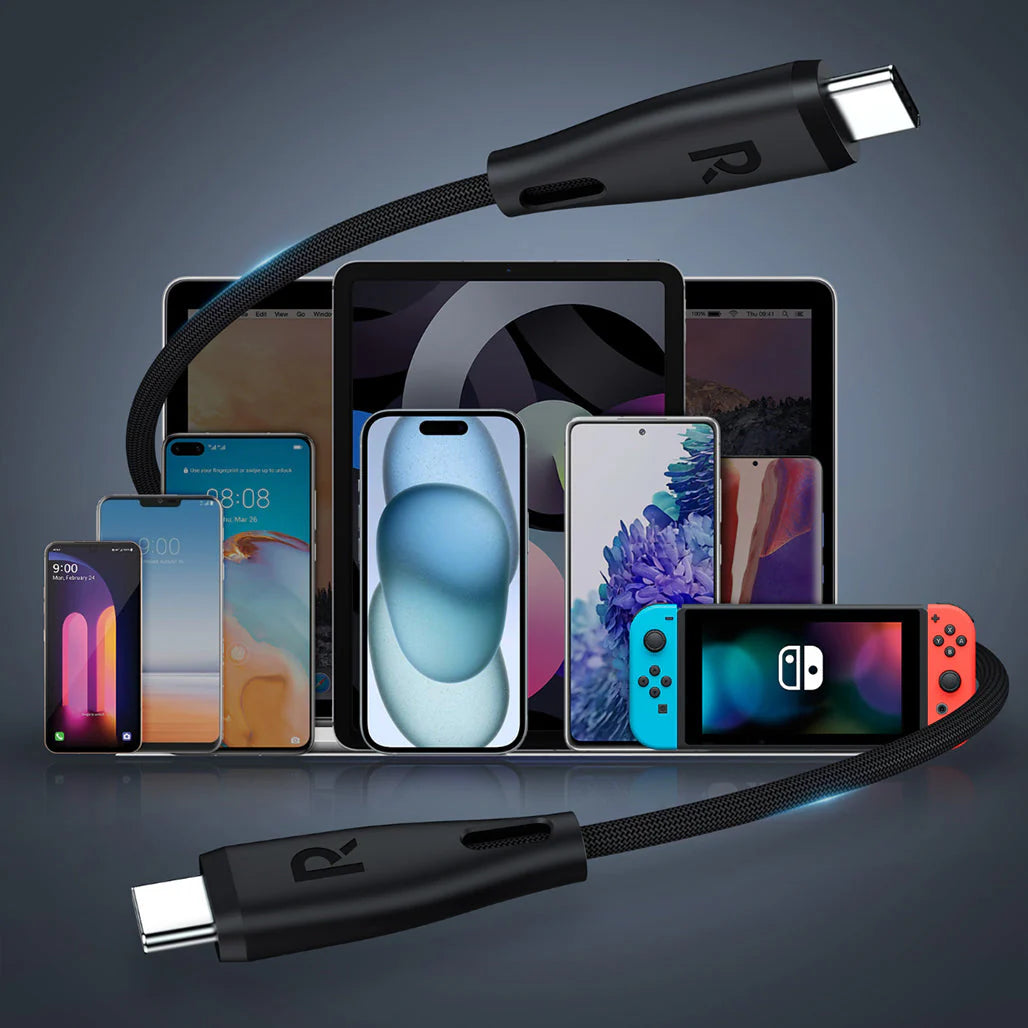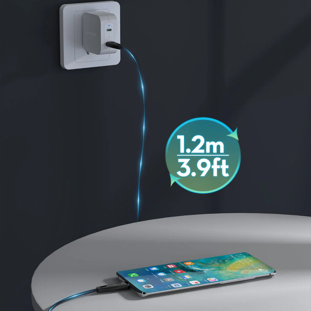RAVPower RP-CB1037 is a USB-C to USB-C cable designed for fast, reliable power and data transfer. It supports up to 60W charging and USB 2.0 data speeds up to 480 Mbps, with support for up to 3A current on compatible devices. The 1.2-meter length gives you flexible reach for desktop setups or couch-side charging. Built with an aluminum alloy connector housing, a TPE core, and a nylon braided jacket, this cable balances rugged durability with a smooth feel and reduced tangling.