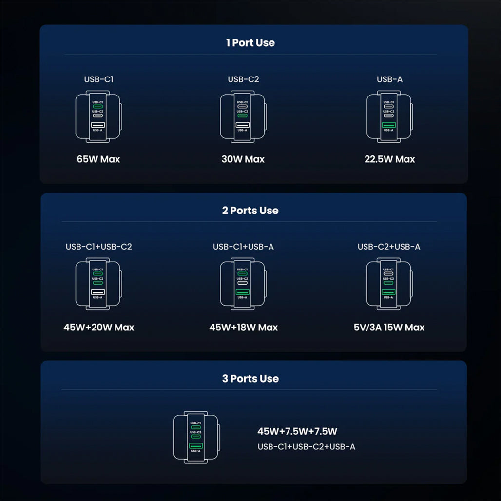 USB-C1 Output: 5V⎓3A / 9V⎓3A / 12V⎓3A / 15V⎓3A / 20V⎓2.25A (65W Max)