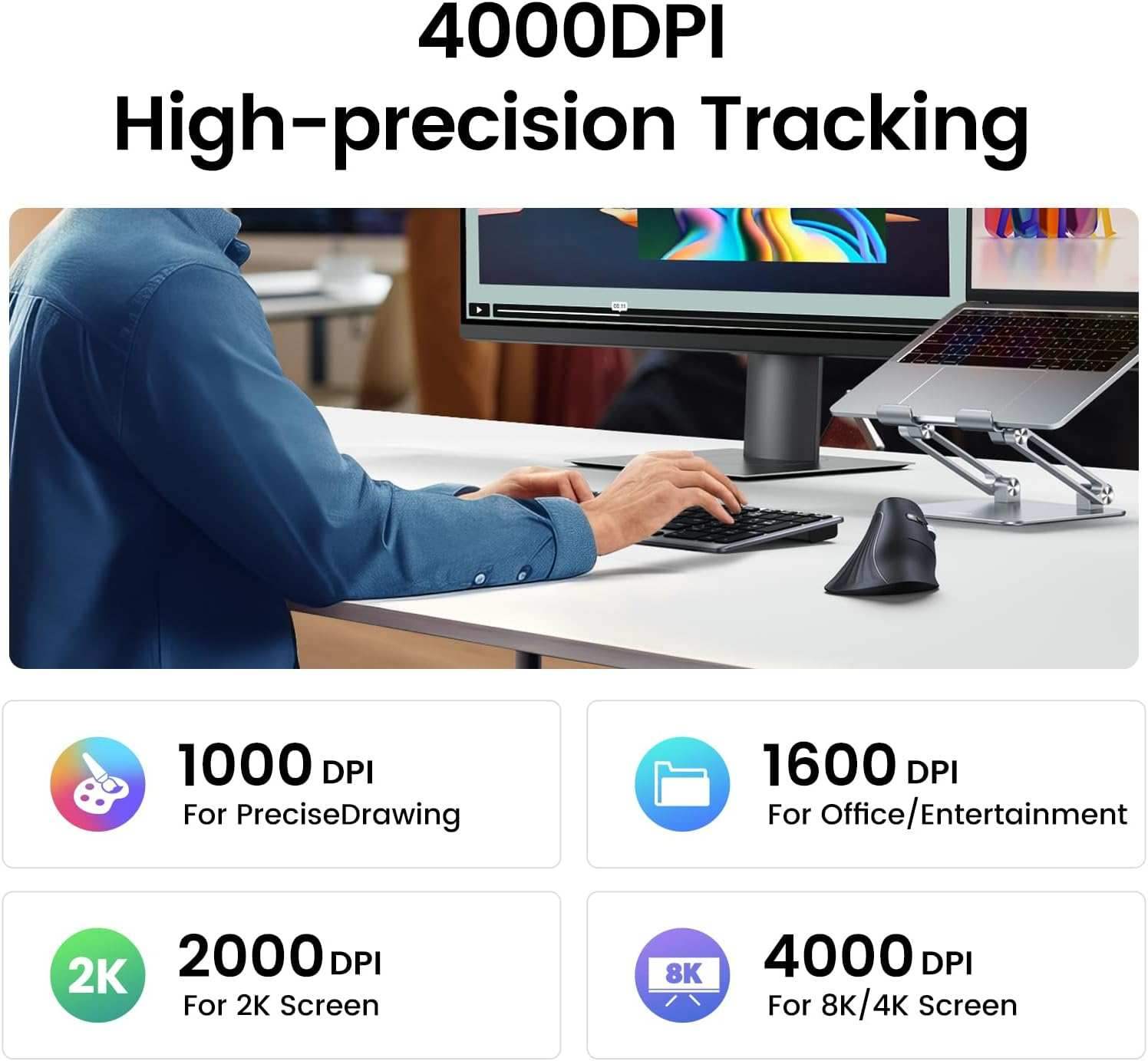 - High DPI and Adjustable Levels: This ergonomic mouse offers a high DPI range with four adjustable levels: 1000, 1600, 2000, and 4000. This provides exceptional precision and control for both desktop and gaming applications